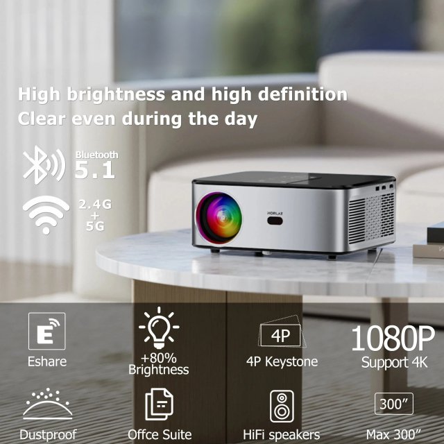 Featuring dual-band 2.4G and 5G WiFi, the projector supports smooth screen mirroring for both iOS and Android devices—ideal for movie nights, presentations, or gaming sessions. It includes multiple ports such as HDMI, USB, and audio output, ensuring compatibility with laptops, consoles, and more. The sleek, portable design and easy setup make it perfect for home use, outdoor gatherings, or professional displays.
